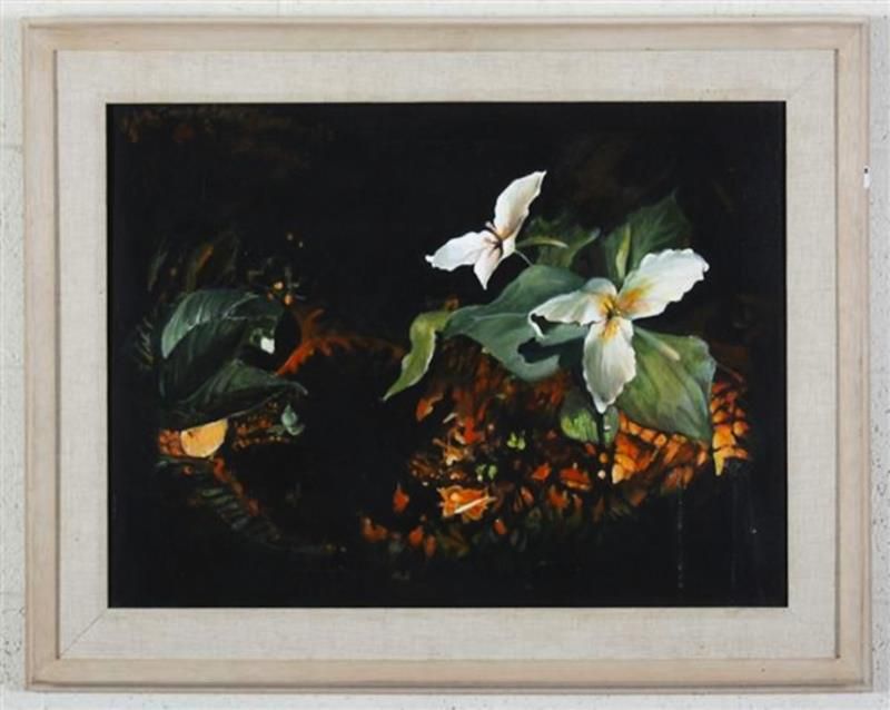 BETTY PHILLIPS OIL ON CANVAS - Unsigned (label on reverse), painting of white flowers titled "The Ravine Dwellers" - Condition good, - Mid to late 20th century - 24" x 29" framed