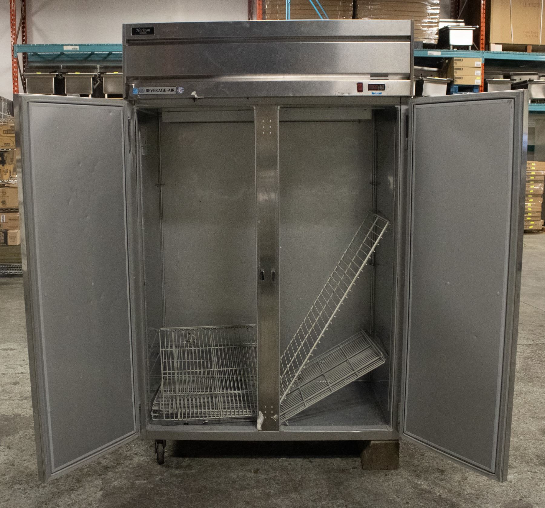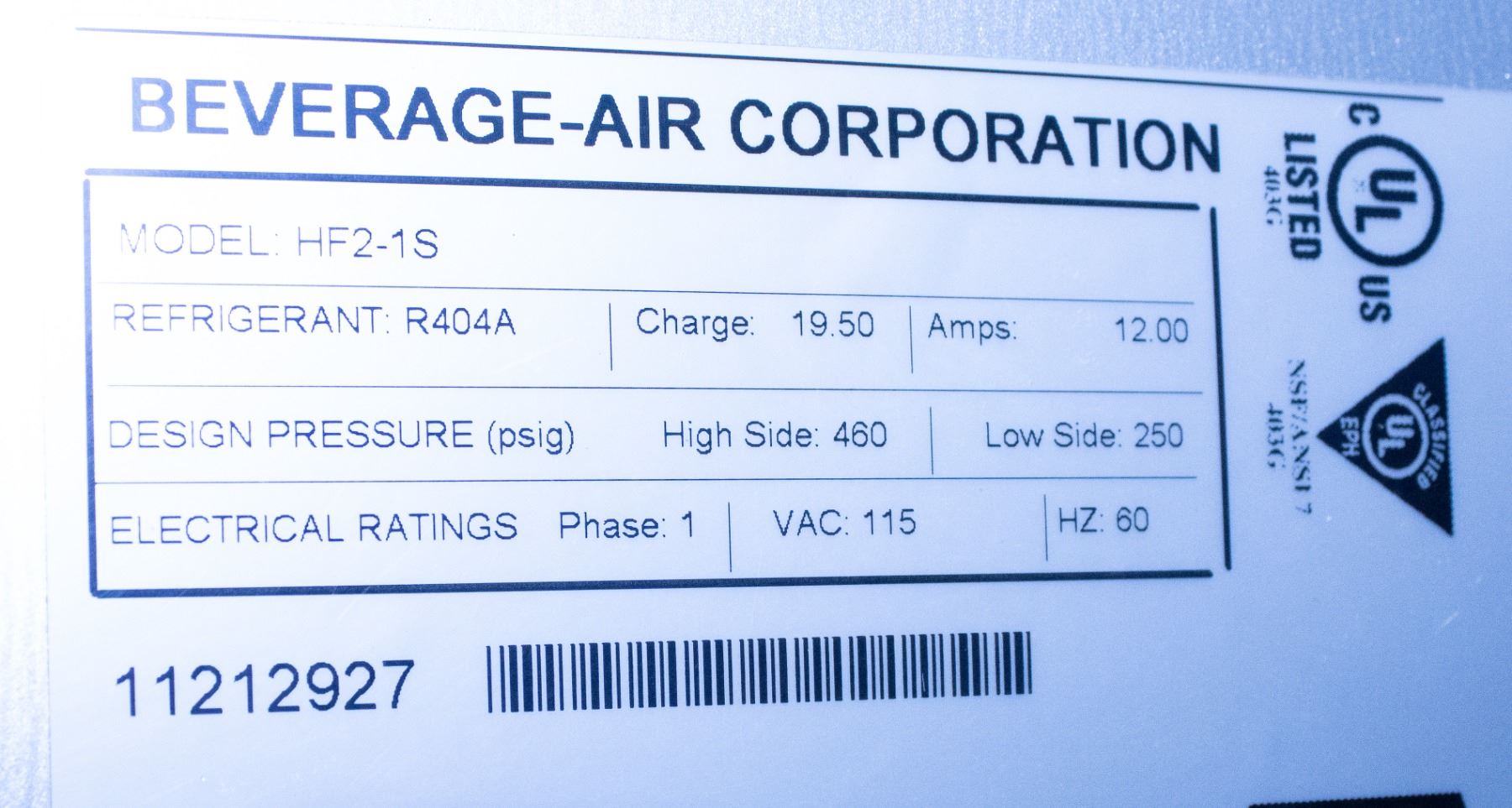 MODEL # HF2-1S, 12 AMPS, PHASE 1, 115 VAC, 60 HZ, 52" X 32" X 84" ** HAS COSMETIC DAMAGE TO THE S/S TRIM & IS MISSING ONE CASTOR **