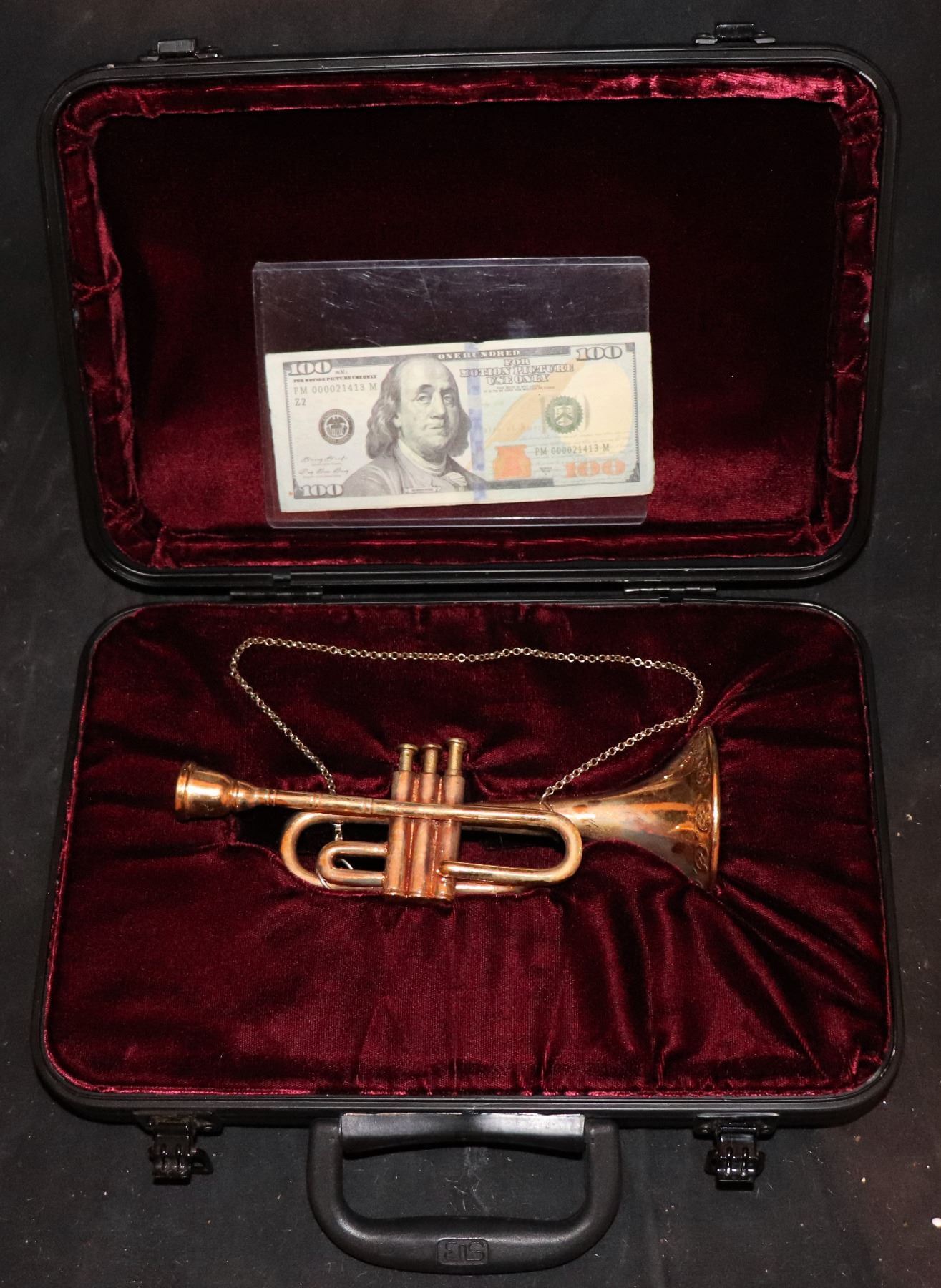 Made of real brass but not a real instrument. Attached chain and SCREEN MATCHED Red Velvet case included!