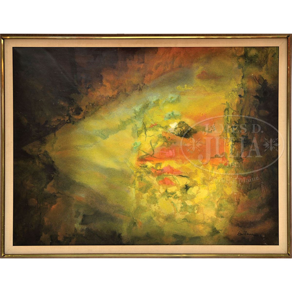 Acrylic on paper Housed in a modern decorative frame with linen liner and plexiglass, on verso is an artist's label, also Portland Museum of Art label, and a label from Beth El Art Festival Signed lower right "Hallam" SIZE: Sight: 29-1/4" x 39-1/4". Overall: 33-1/2" x 43-1/4". CONDITION: Very good. 9-29926