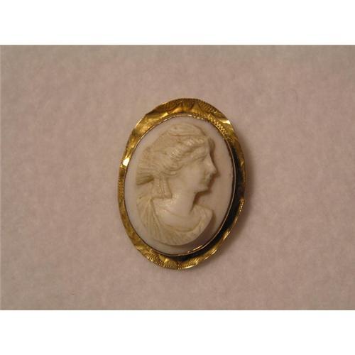 Antique shell cameo. The frame is 10 karat gold and has some damage from being bent. The pin is in good condition. Very pretty face on this piece.