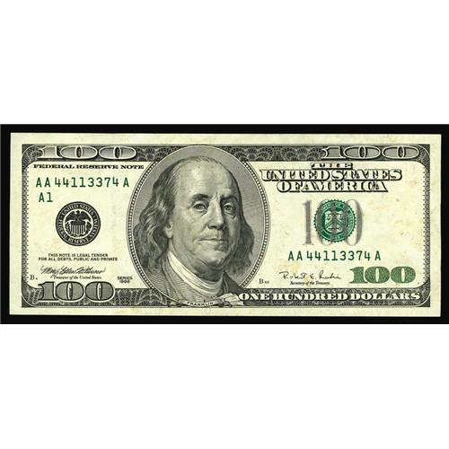 <B>Fr. 2175-A $100 1996 Federal Reserve Note. About Uncirculated.</B></I> A blank reverse example, scarce on hundreds and especially scarce on the new hundreds. While high grade, there is a bit of light discoloration on the reverse which sounds worse than it appears.