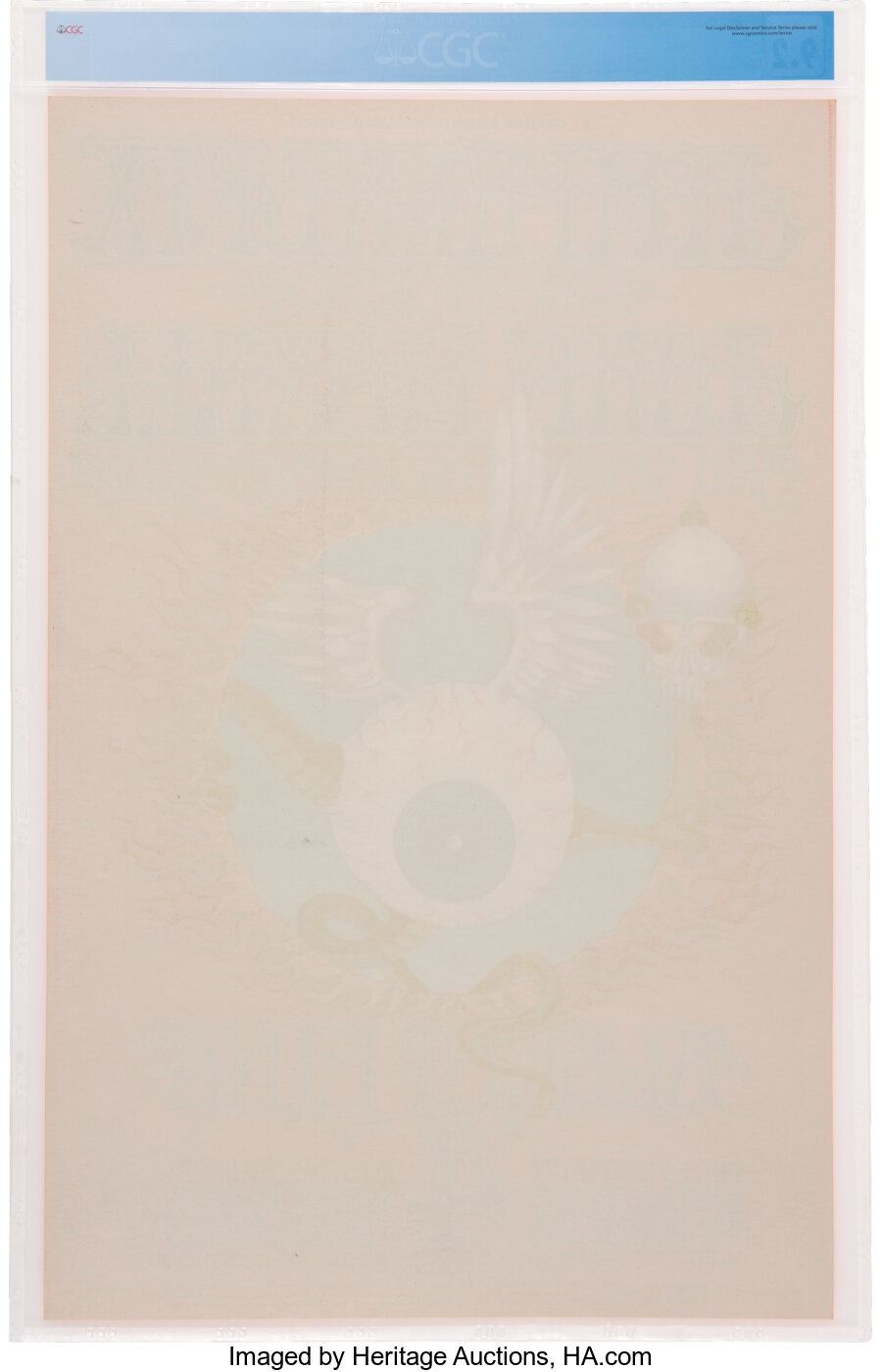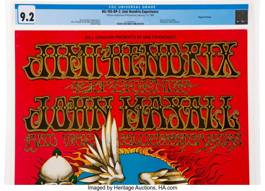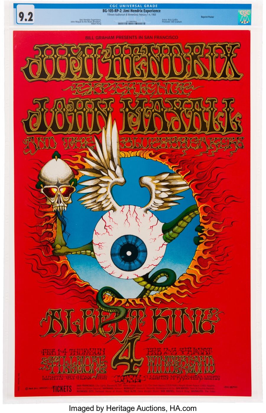 BG-105 Jimi Hendrix Experience Second Printing 1968 "Flying Eyeball" Poster CGC-graded 9.2. An original Bill Graham second-printing poster of The Jimi Hendrix Experience, John Mayall and the Bluesbreakers and Albert King at San Francisco's famed Fillmore and Winterland ballrooms on the first four days of February 1968, known in the hobby as BG-105. Most art-rock fans and collectors consider this to be designer Rick Griffin's masterpiece.