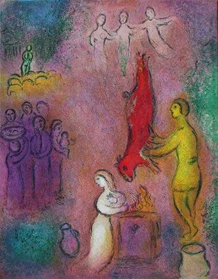 Marc Chagall was born in 1887 to a poor Jewish family in Russia. He was the eldest of nine children. Chagall began to display his artistic talent while studying at a secular Russian school, and despite his father’s disapproval, in 1907 he began studying art with Leon Bakst in St. Petersburg. It was at this time that his distinct style that we recognize today began to emerge. As his paintings began to center on images from his childhood, the focus that would guide his artistic motivation for the rest of his life came to fruition. In 1910, Chagall, moved to Paris for four years. It was during this period that he painted some of his most famous paintings of the Jewish village, and developed the features that became recognizable trademarks of his art. Strong and bright colors began to portray the world in a dreamlike state. Fantasy, nostalgia, and religion began to fuse together to create otherworldly images. In 1914, before the outbreak of World War I, Chagall held a one-man show in Berlin, exhibiting work dominated by Jewish images. During the war, he resided in Russia, and in 1917, endorsing the revolution, he was appointed Commissar for Fine Arts in Vitebsk and then director of the newly established Free Academy of Art. In 1922, Chagall left Russia, settling in France one year later. He lived there permanently except for the years 1941 - 1948 when, fleeing France during World War II, he resided in the United States. Chagall's horror over the Nazi rise to power is expressed in works depicting Jewish martyrs and refugees. In addition to images of the Jewish world, Chagall's paintings are inspired by themes from the Bible. His fascination with the Bible culminated in a series of over 100 etchings illustrating the Bible, many of which incorporate elements from folklore and from religious life in Russia. Israel, which Chagall first visited in 1931 for the opening of the Tel Aviv Art Museum, is likewise endowed with some of Chagall's work, most notably the twelve stained glass windows at Hadassah Hospital and wall decorations at the Knesset. Chagall received many prizes and much recognition for his work. He was also one of very few artists to exhibit work at the Louvre in their lifetime.