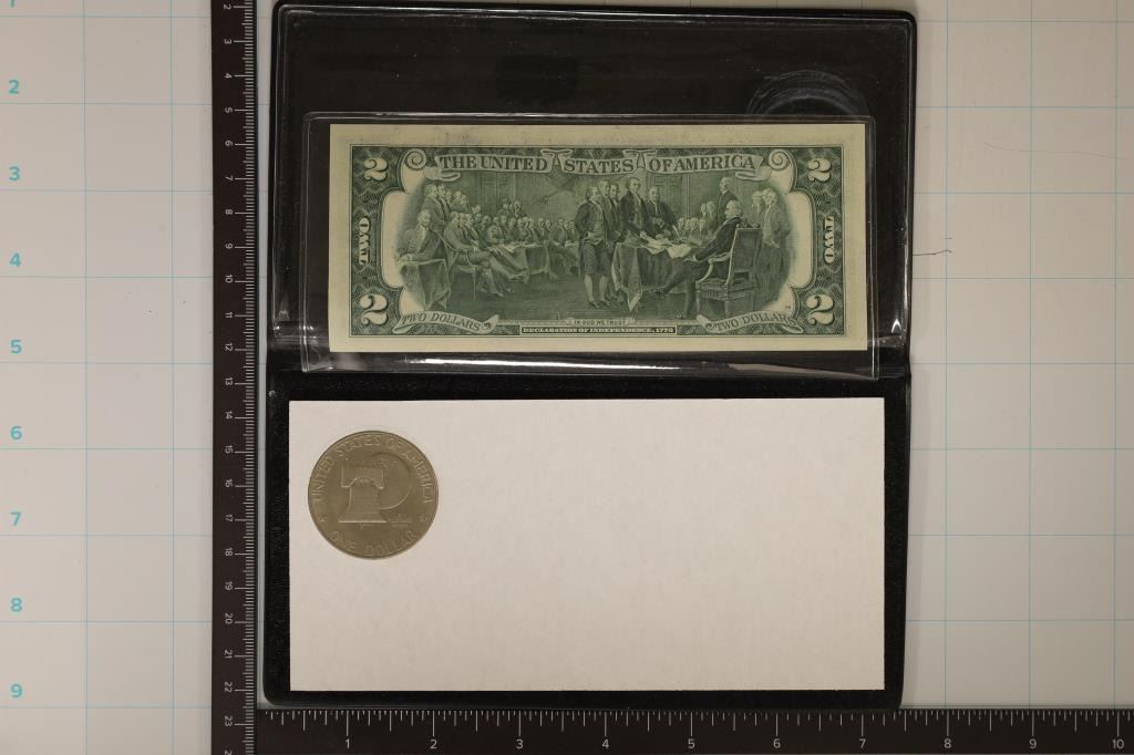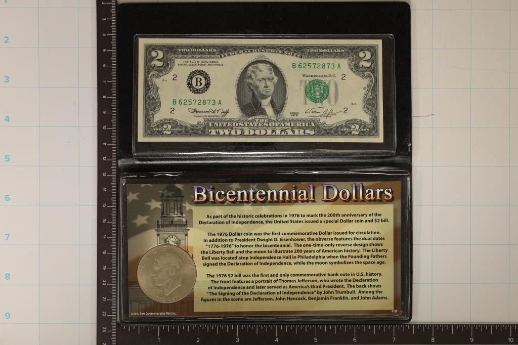 GREEN SEAL AND A 1976-D IKE DOLLAR IN BLACK FOLIO WITH INFO CARD. THE IKE DOLLAR IS UNC AND THE BILL IS CRISP UNC