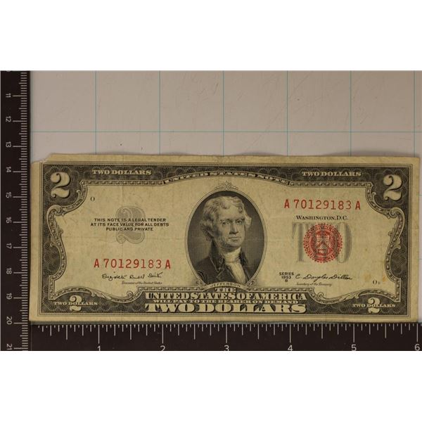 1953-B US $2 RED SEAL NOTE UPPER LEFT CORNER HAS30 - 1953-B US $2 RED SEAL NOTE UPPER LEFT CORNER HAS