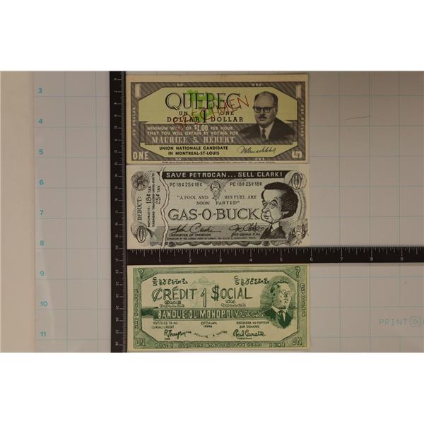 $1 SPECIMEN BILL, 1-CANADA GAS-O-BUCK A FOOL AND HIS FUEL ARE SOON PARTED AND 1-CANADA CREDIT ONE SOCIAL DOLLAR BANK OF MONOPOLY 1999 OTTAWA