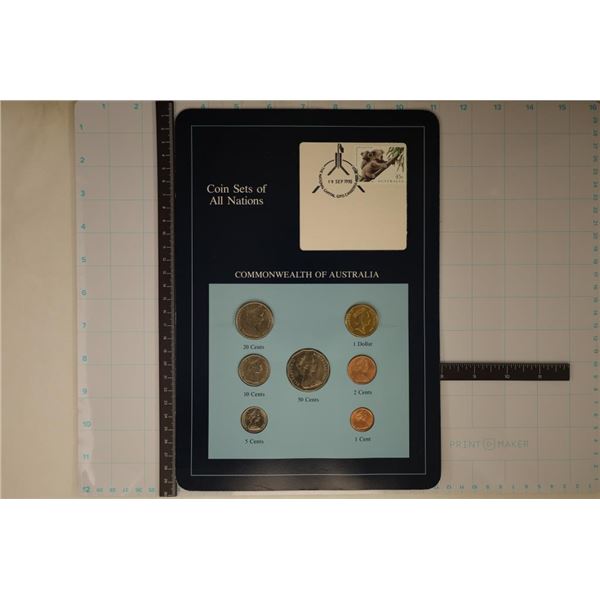 AUSTRALIA", 7 COIN BRILLIANT UNC SET ON BLUE CARDBOARD WITH CANCELLED STAMP