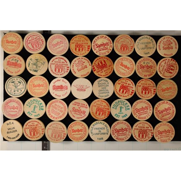40 ASSORTED WOODEN NICKELS: SAMBO'S, FUDPUCKER
