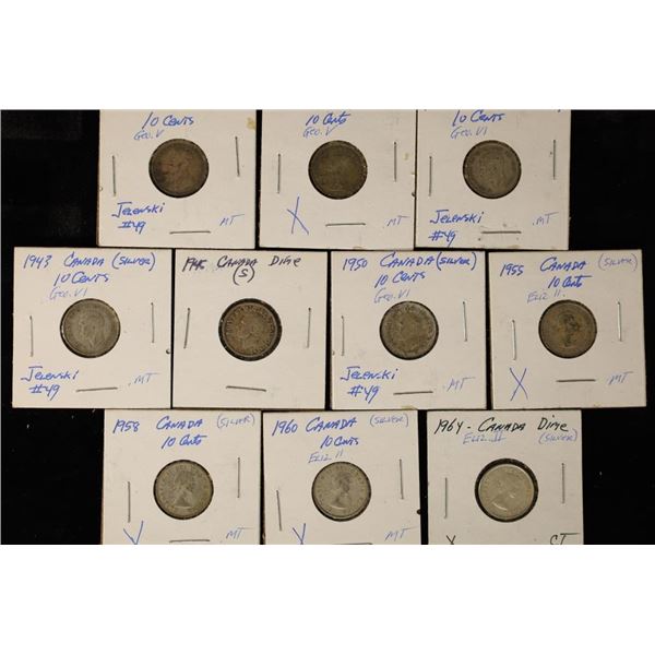10 CANADA SILVER 10 CENT COINS: 1916-1964 (.60324