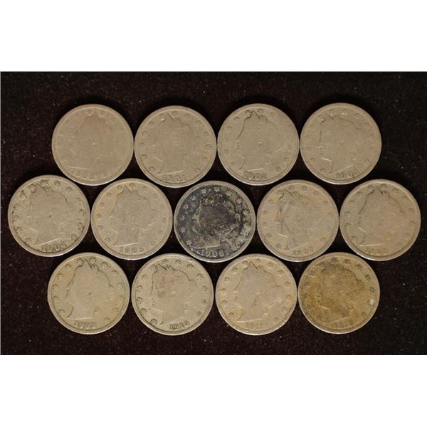 13 LIBERTY "V" NICKELS 1900-1912. ONE OF EACH DATE