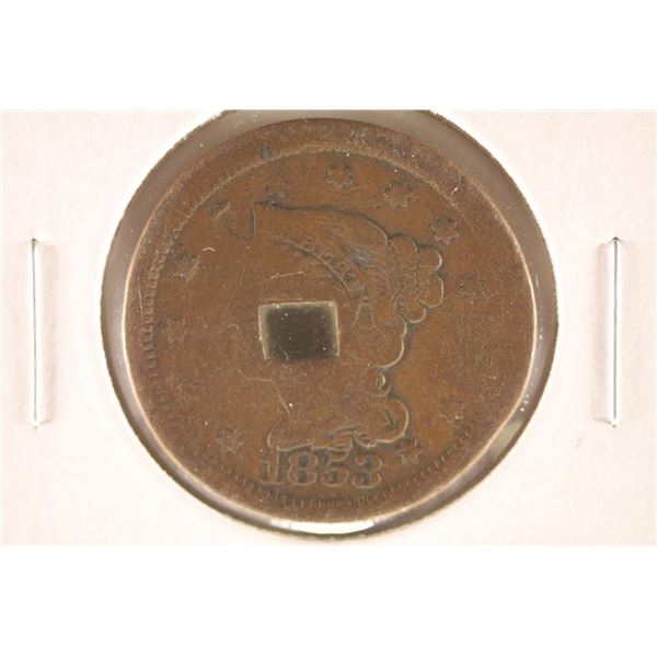 1853 US LARGE CENT AS SHOWN SQUARE PUNCH MARK
