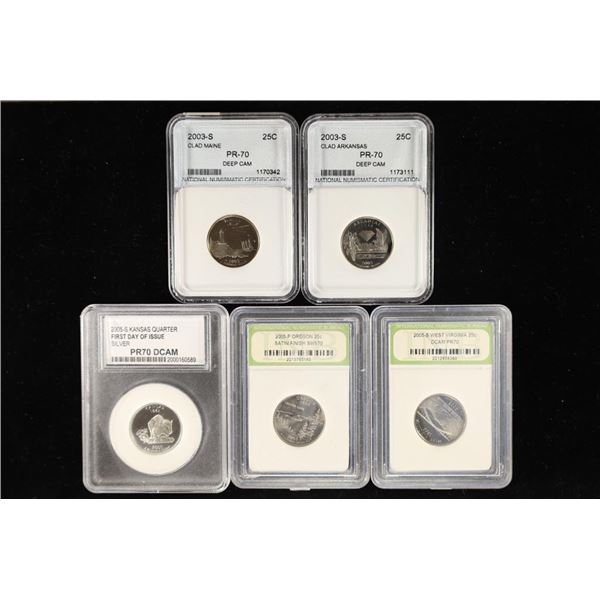 2003-S ARKANSAS PR70 DEEP CAM, 2005-S SILVER KANSAS 1ST DAY OF ISSUE PR70 DCAM, 2005-P OREGON SATIN FINISH SMS 70 AND 2005-S WEST VIRGINIA DCAM PR7