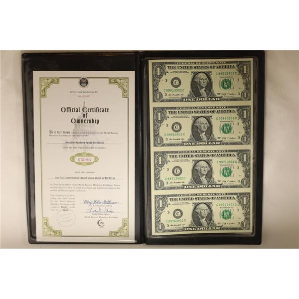 2009 UNCUT SHEET OF 4-$1 FRN'S CRISP UNC IN NICE