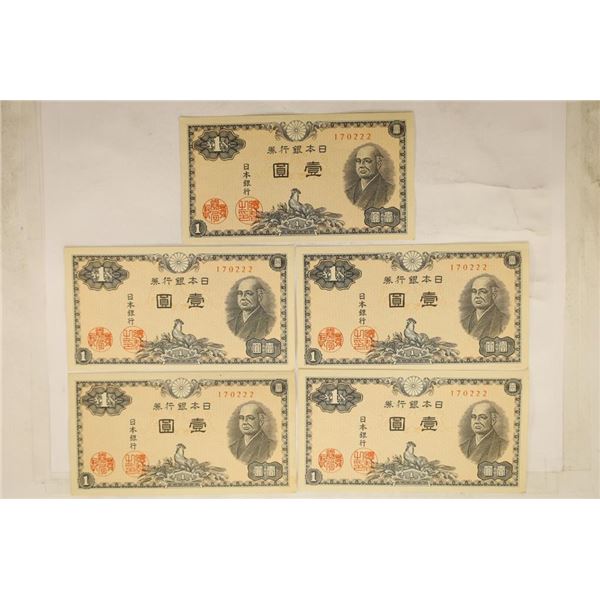 5- JAPAN 1 YEN BILLS CRISP UNC56 - 5- JAPAN 1 YEN BILLS CRISP UNC