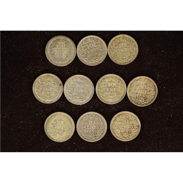 10 NETHERLANDS "WILHELMINA" SILVER 10 CENT COINS:62 - 10 NETHERLANDS "WILHELMINA" SILVER 10 CENT COINS: