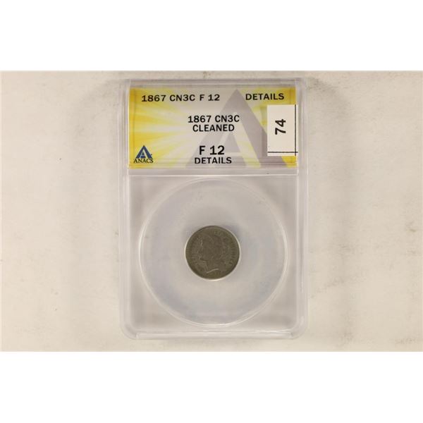 1867 THREE CENT PIECE (NICKEL) ANACS F12 DETAILS74 - 1867 THREE CENT PIECE (NICKEL) ANACS F12 DETAILS