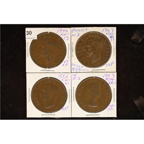 4 NEW ZEALAND 1 PENNY COINS 1946,1947,1952 & 195330 - 4 NEW ZEALAND 1 PENNY COINS 1946,1947,1952 & 1953