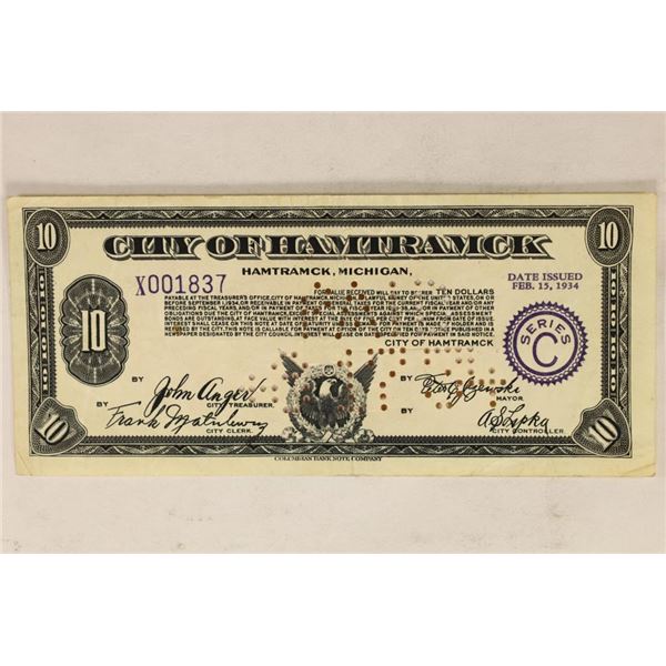 1934 CITY OF HAMTRAMACK MICHIGAN $10 TAX PAYMENT271 - 1934 CITY OF HAMTRAMACK MICHIGAN $10 TAX PAYMENT