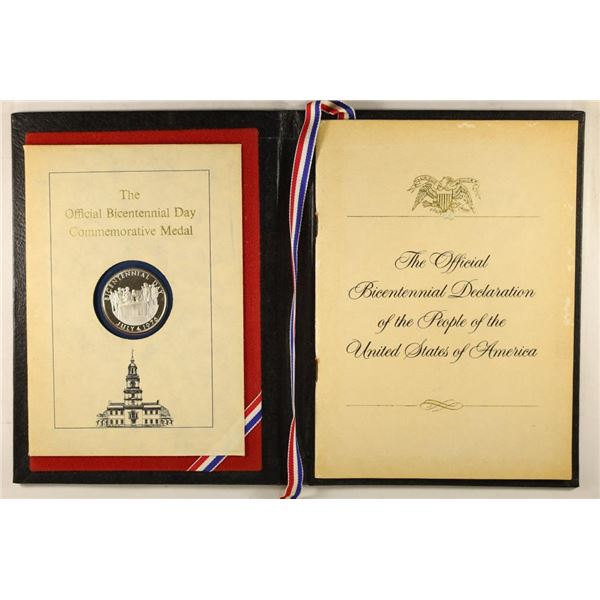 COIN IN FOLIO. OFFICIAL BICENTENNIAL DECLARATION OF THE PEOPLE OF THE UNITED STATES OF AMERICA. INCLUDES SOLID STERLING SILVER PROOF MEDAL MINTED I
