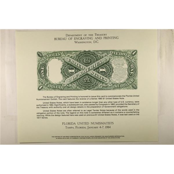 SOUVENIR SHEET FEATURING THE REVERSE OF SERIES 1880 $1 US NOTE, PRINTED BY THE BUREAU OF ENGRAVING AND PRINTING