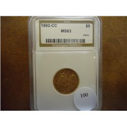 1892-CC $5 GOLD HALF EAGLE NAS MS63