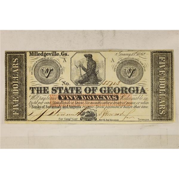 1862 MILLEDGEVILLE, GEORGIA $5 OBSOLETE BANK NOTE