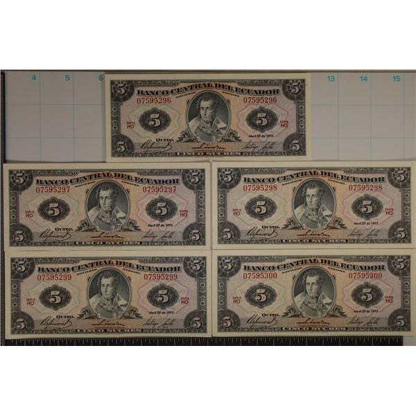 5-1977 ECUADOR 5 SUCRES BILLS. CRISP UNC