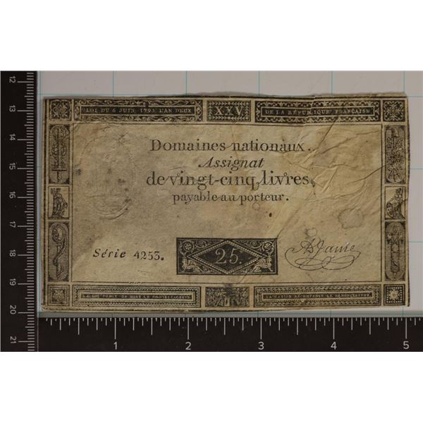 1793 FRANCE 25 LIVRES ASSIGNAT NOTE SOME PIN HOLES
