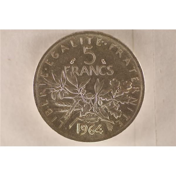 1964 FRANCE SILVER 5 FRANCS .3221 OZ. ASW UNC WITH