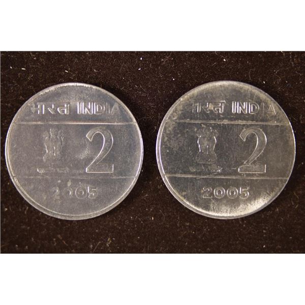 2005 INDIA 2 RUPEE COINS. LARGE AND SMALL DATE