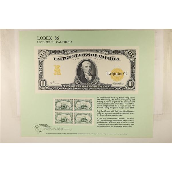 FEATURING THE OBV. OF AN 1907 $10 GOLD CERTIFICATE AND REPLICA OF FOUR 1898 SERIES 50 CENT WESTERN MINING PROSPECTOR STAMPS, PRINTED BY THE BUREAU