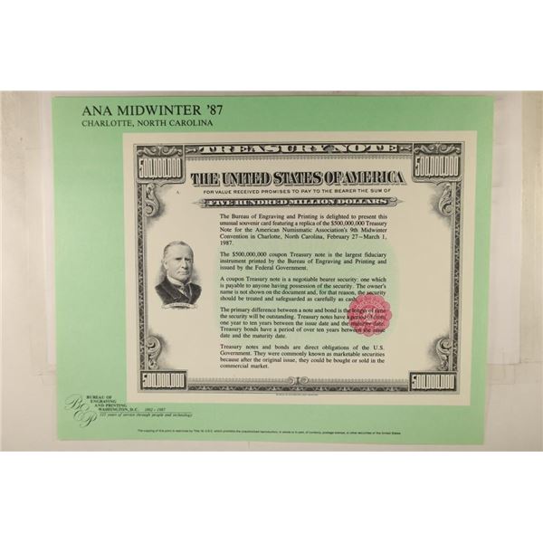 SOUVENIR CARD FEATURING THE OBV. OF A US 500,000,000 TREASURY NOTE, PRINTED BY THE BUREAU OF ENGRAVING AND PRINTING