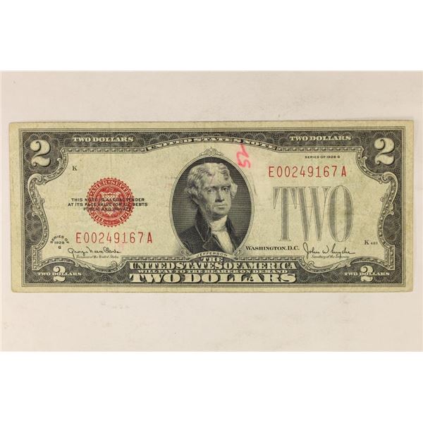 1928-G $2 US NOTE RED SEAL NOTE. WRITING ON OBV.