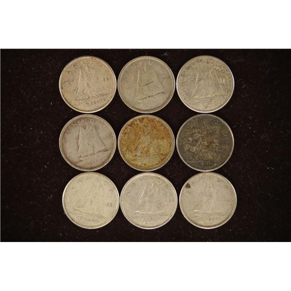 9 ASSORTED SILVER CANADA 10 CENTS:1940-1965
