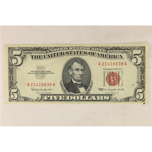 1963 $5 US NOTE RED SEAL CRISP SMALL SPOT ON LOWER