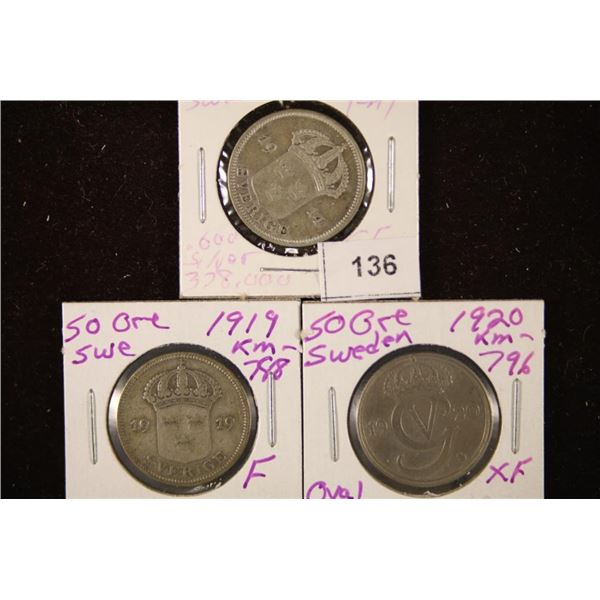 1914, 1919 & 1920 SWEDEN SILVER 50 ORE COINS
