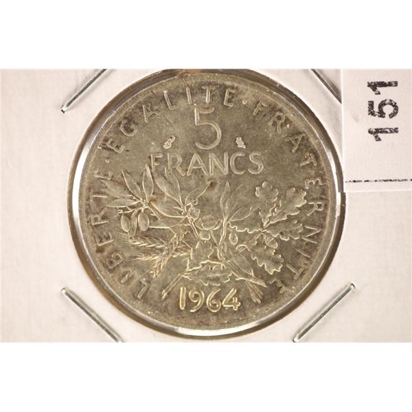 1964 FRANCE SILVER 5 FRANCS .3221 OZ. ASW AU