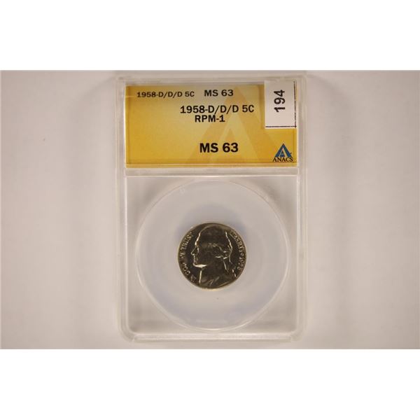 1958 JEFFERSON NICKEL ANACS MS63 D/D/D RPM-1