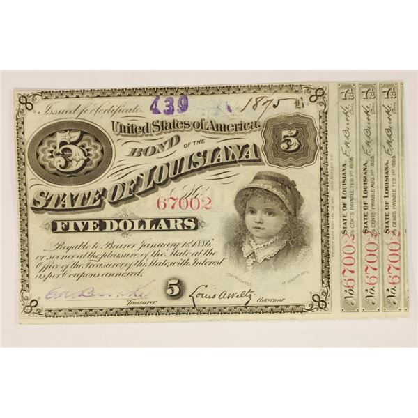 1875 STATE OF LOUISIANA $5 US BOND ALSO CALLED