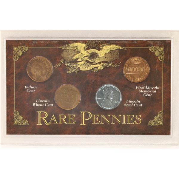 CENT, 1956 LINCOLN WHEAT CENT, 1943 STEEL LINCOLN CENT AND 1959-D 1ST LINCOLN MEMORIAL CENT. IN HARD PLASTIC DISPLAY CASE