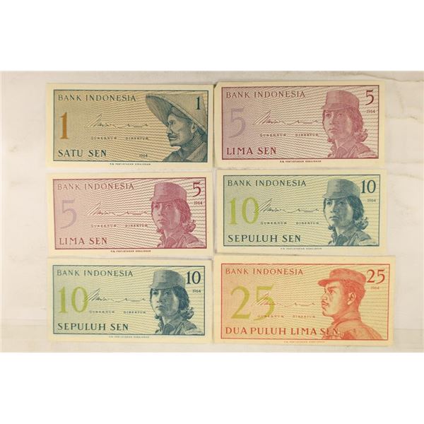 6 INDONESIA BILLS: 1964 1 SEN, 2-1964 5 SEN, 2-13 - 6 INDONESIA BILLS: 1964 1 SEN, 2-1964 5 SEN, 2-