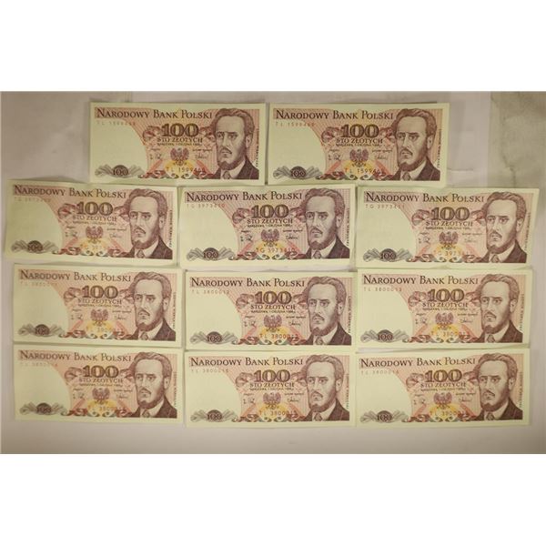 11 POLISH 100 ZLOTYCH CRISP UNC BILLS. 1 SET OF 6