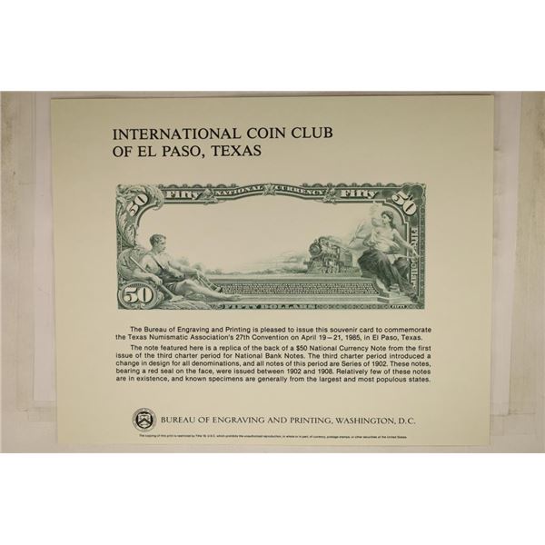 CARD WITH ENGRAVING OF A 1902 $50 US NATIONAL CURRENCY NOTE PRINTED BY THE BUREAU OF ENGRAVING AND PRINTING