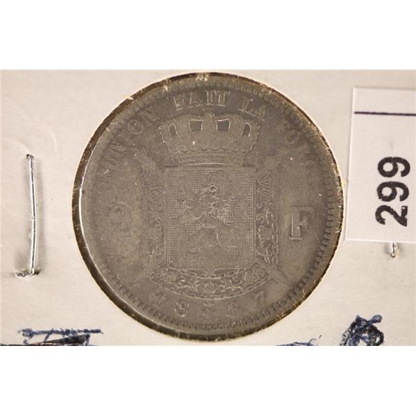 1867 BELGIUM SILVER 2 FRANC COIN .2685 OZ. ASW