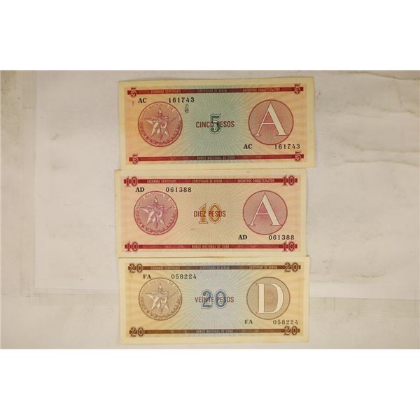 CUBA 5,10 & 20 PESOS FOREIGN EXCHANGE CERTIFICATES168 - CUBA 5,10 & 20 PESOS FOREIGN EXCHANGE CERTIFICATES