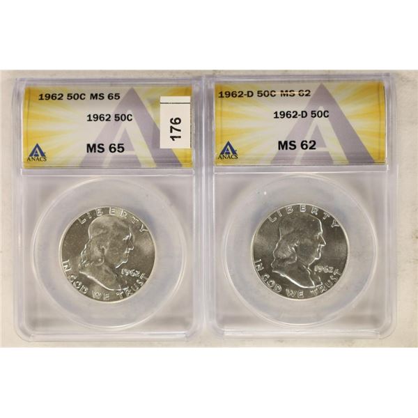 2 ANACS CERTIFIED FRANKLIN HALF DOLLARS: 1962 MS65176 - 2 ANACS CERTIFIED FRANKLIN HALF DOLLARS: 1962 MS65