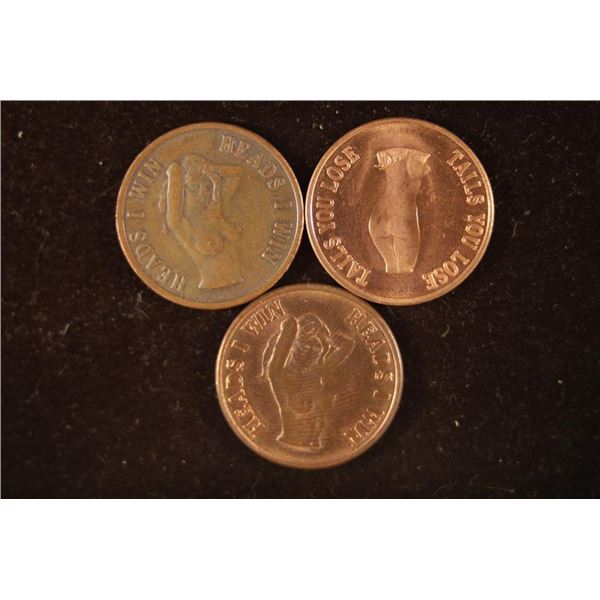 3  ADULT THEMED 1" METAL FLIPPER TOKENS. OBVERSE199 - 3 ADULT THEMED 1" METAL FLIPPER TOKENS. OBVERSE