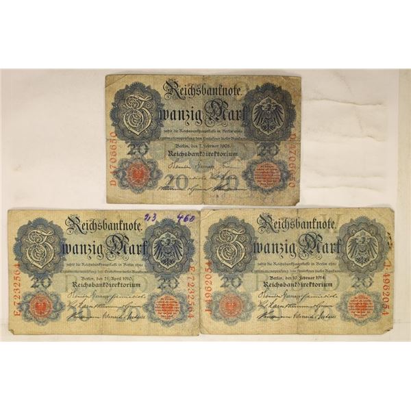 1908, 1910 & 1914 GERMAN 20 MARK BILLS277 - 1908, 1910 & 1914 GERMAN 20 MARK BILLS