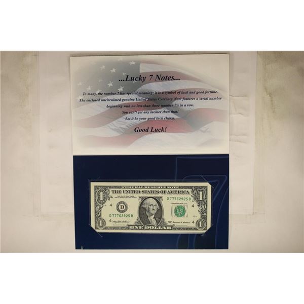 1999 LUCKY 7'S $1 U.S. FRN CRISP UNC WITH SERIAL #279 - 1999 LUCKY 7'S $1 U.S. FRN CRISP UNC WITH SERIAL #